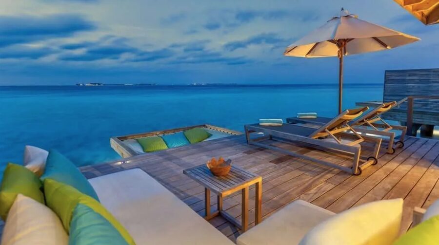 The Sunset Laamu Water Villas face west from the end of the jetty and deliver exactly what the name promises. Activities range from turtle hatchings (May–August) and snorkeling to private stargazing screenings and dolphin sunset cruises. A strong fit for couples who want variety, not just stillness.