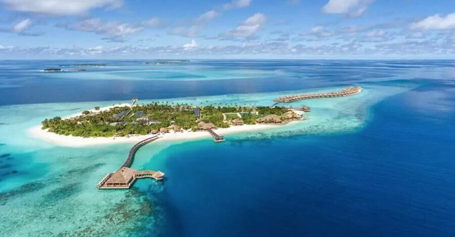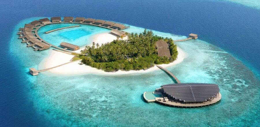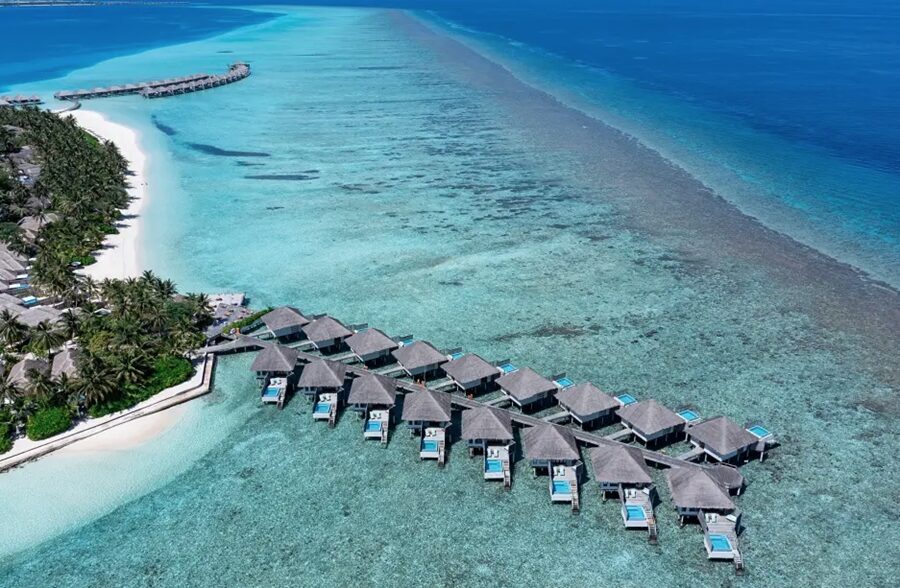 Architecturally striking—the bar is shaped like a whale shark—and built around its marine environment rather than ignoring it. Seventy-seven villas, one of the largest hydrotherapy pools in the Maldives, and an on-staff marine biologist overseeing a coral recovery program guests can take part in.