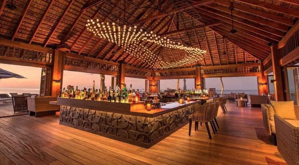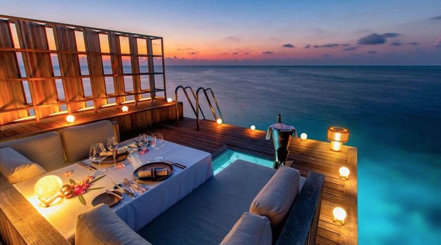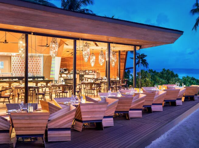 The standout: the 5.8 Undersea Restaurant, named for its depth—5.8 meters below the surface. You dine inside a glass dome with open ocean on all sides. Guided sailing excursions across the atoll are worth booking in advance.